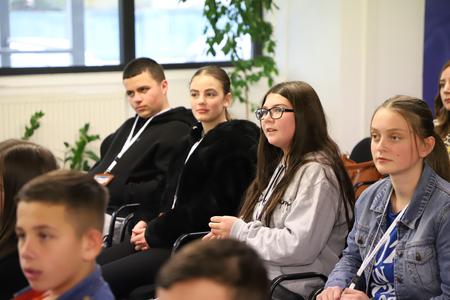 The students, belonging to the sixth, seventh, eighth and ninth grade, had the opportunity to learn about the Mission’s role in Kosovo from the Head of EULEX’s Press and Public Information Office and Spokesperson, Ioanna Lachana, and EULEX’s Communication Officer, Mirsad Aliti.